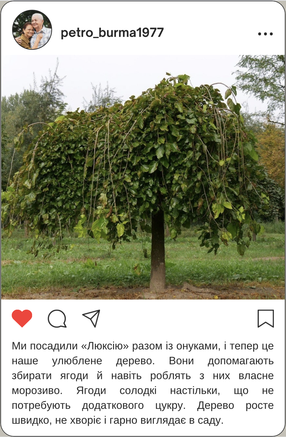 «Люксія» поєднує в собі красу, користь та високу врожайність — із одного дерева ви отримаєте відра смачних ягід щороку.